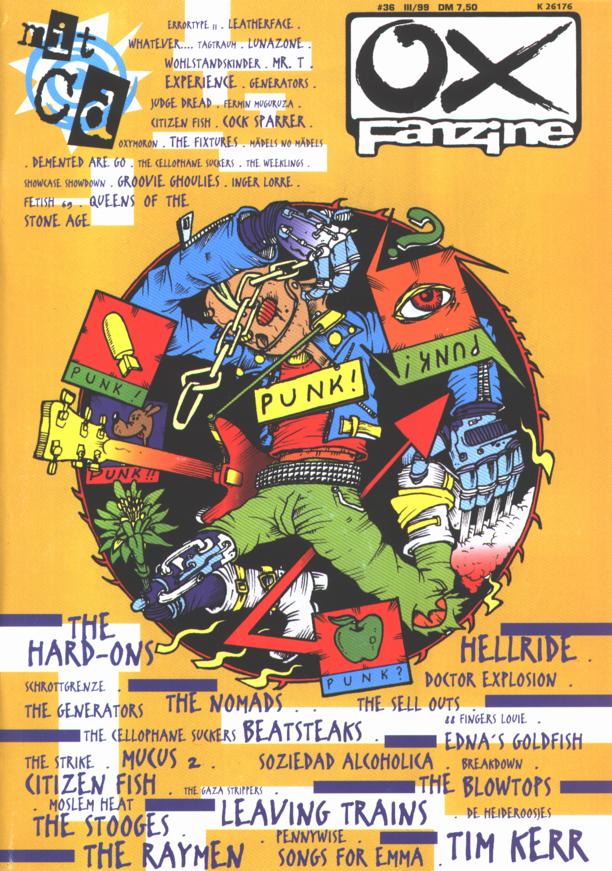 Recently, I received the German punkrock magazine Ox from my new record mailorder. I'm not sure, when this fine piece of literature was published, but it seems to be from late summer/autumn '99. It features an interview with Blackie, two concert reviews (Aachen (D) and Madrid (E)) and the cover drawn by Ray depicted to the right: